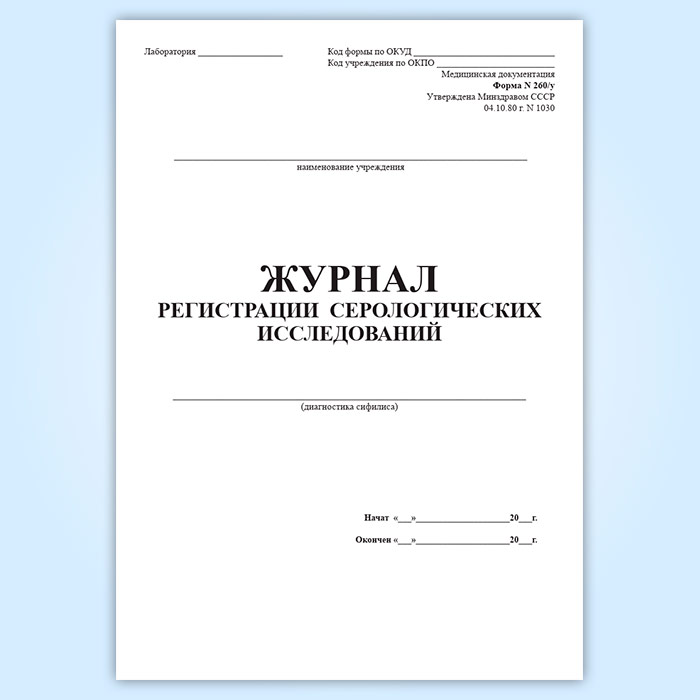 Форма журнала регистрации серологических исследований (диагностика сифилиса) форма 260/у утверждена Приказом Минздрава СССР №1030 «Об утверждении форм первичной медицинской документации учреждений здравоохранения» от 04 октября 1980 (с изменениями на 31 декабря 2002 года).