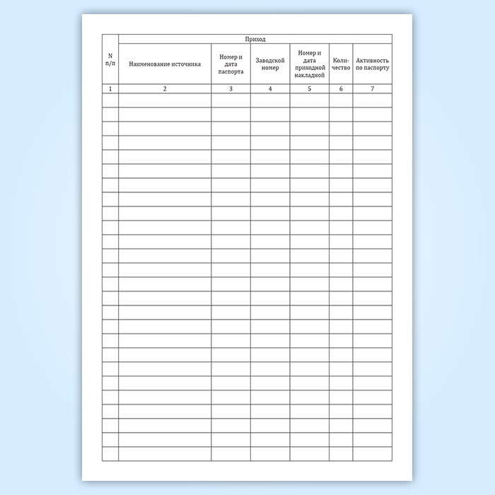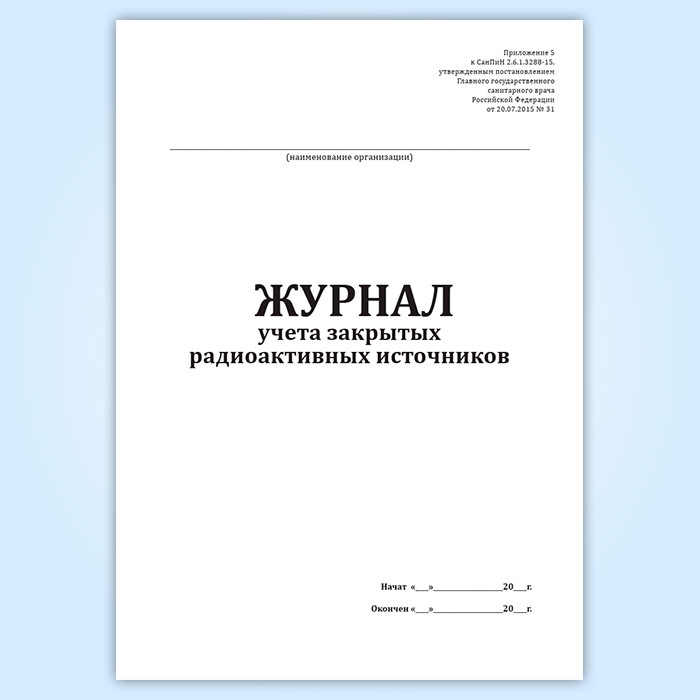 Форма журнала учета закрытых радиоактивных источников соответствует Приложению 5 к СанПиН 2.6.1.3288-15. Гигиенические требования по обеспечению радиационной безопасности при подготовке и проведении позитронной эмиссионной томографии.