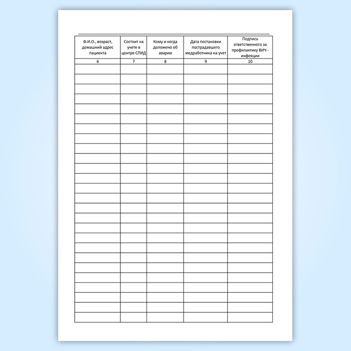 Графы журнала учета аварийных ситуаций по риску профессионального заражения ВИЧ-инфекцией медицинских работников: