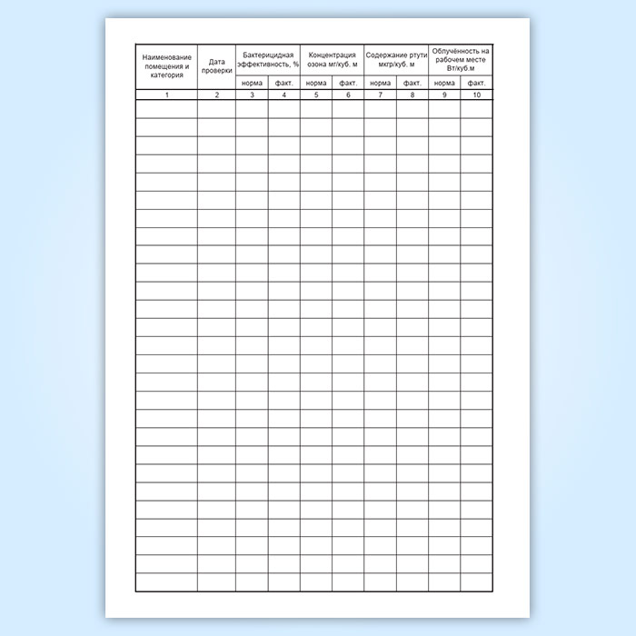 Журнал регистрации и контроля бактерицидной установки имеет графы: