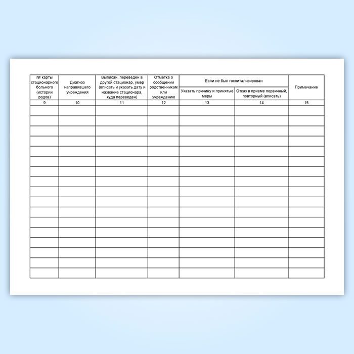 Журнал служит для регистрации больных, поступающих в стационар. Записи в журнале позволяют разрабатывать данные о поступивших больных, о частоте и причинах отказов в госпитализации. Его ведут в приемном отделении больницы, один на всю больницу.