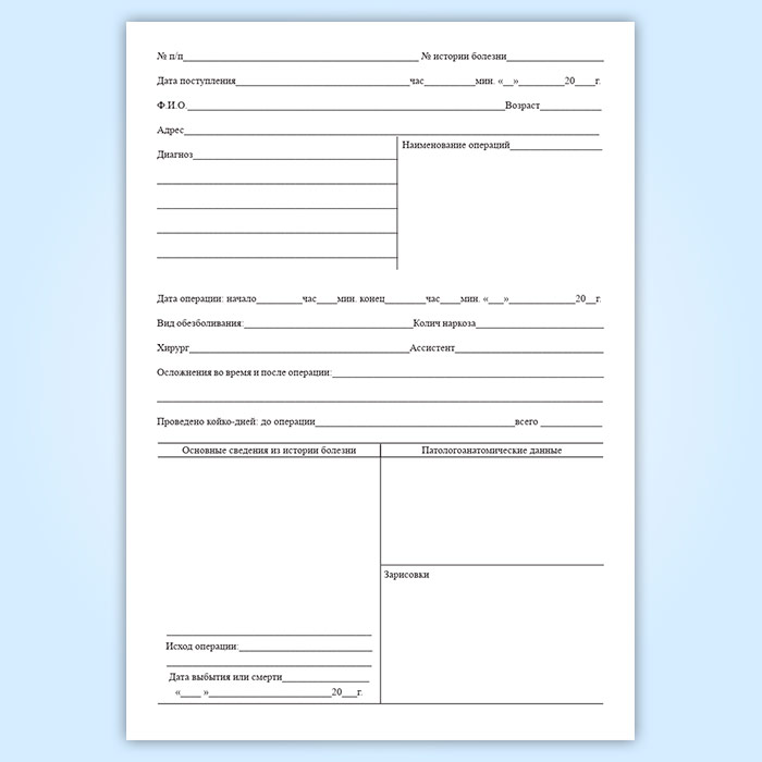 В журнале регистрируются все произведенные в клинике хирургические вмешательства, при этом кратко описывается ход операции, указывается вид обезболивания, записывается фамилия оперирующего хирурга и операционной сестры.