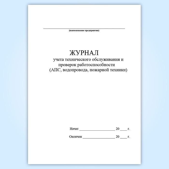 Форма журнала учета технического обслуживания и проверок работоспособности (АПС, водопровода, пожарной техники) соответствует Приложению 10 к документу Правила пожарной безопасности для учреждений здравоохранения ППБО 07-91)