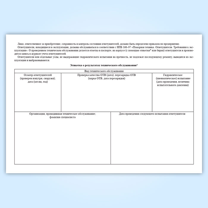 На каждый огнетушитель, установленный на объекте, заводят паспорт. Огнетушителю присваивают порядковый номер, который наносят краской на огнетушитель, записывают в паспорт огнетушителя и в журнал учета проверки наличия и состояния первичных средств пожаротушения.