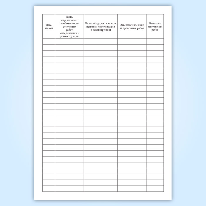 Для учета проведенных работ по модернизации и реконструкции и как модно сейчас говорить реновации, а также оставленных заявок на проведение ремонтных работ, пользуются специальным журналом.