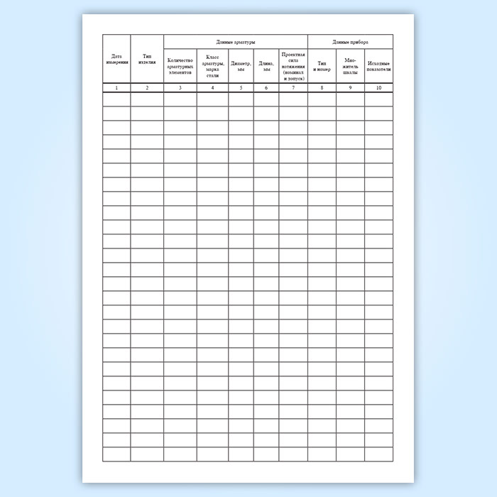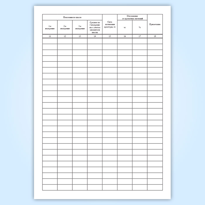 Существует несколько способов измерения силы натяжения арматуры. Результаты измерения силы натяжения арматуры должны записываться в журнал. Возможно использование аналогичного журнала для записи результатов измерения прочностных характеристик арматуры.