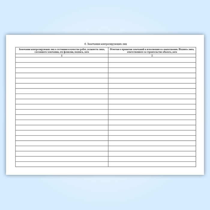 11. В табл. 6 вносятся замечания лиц, контролирующих производство и качество работ, и делаются отметки об исполнение этих распоряжений.
