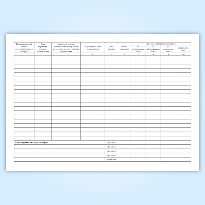 Сопроводительные паспорта регистрируются собственником отходов производства в журнале регистрации сопроводительных паспортов перевозки отходов производства. В конце налогового периода в журнале регистрации сопроводительных паспортов перевозки отходов производства указывается общий объем отходов производства (по классам опасности), переданных на использование, обезвреживание, хранение, захоронение.