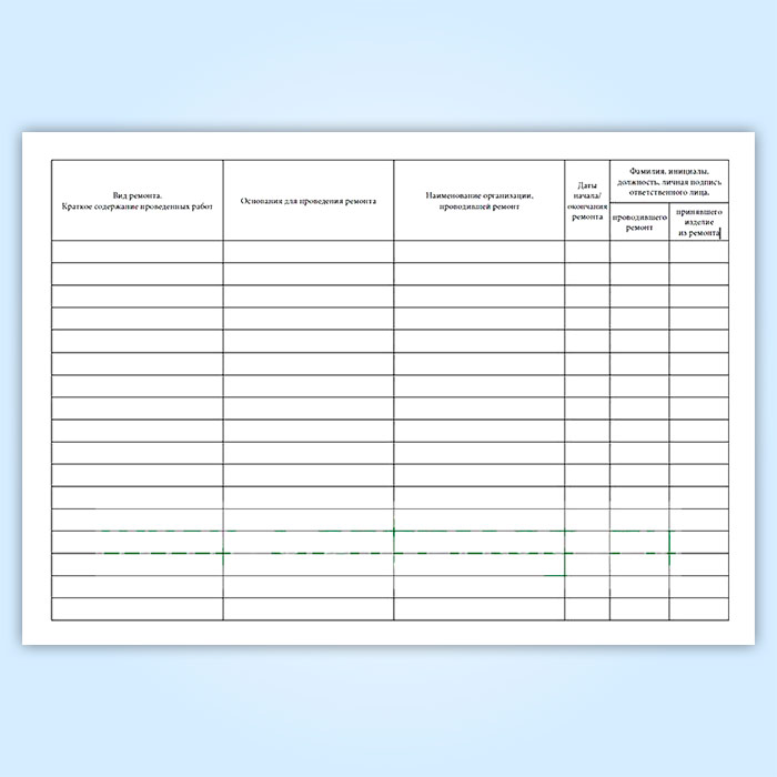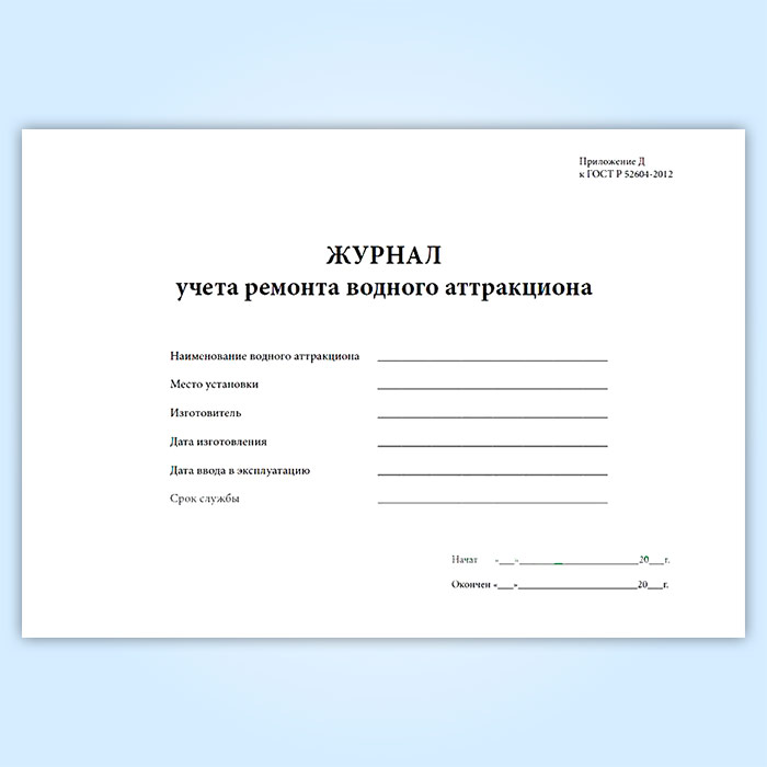 Форма журнала учета ремонта водного аттракциона соответствует приложению Д к ГОСТ Р 52604-2012 Аттракционы водные. Безопасность при эксплуатации. Общие требования