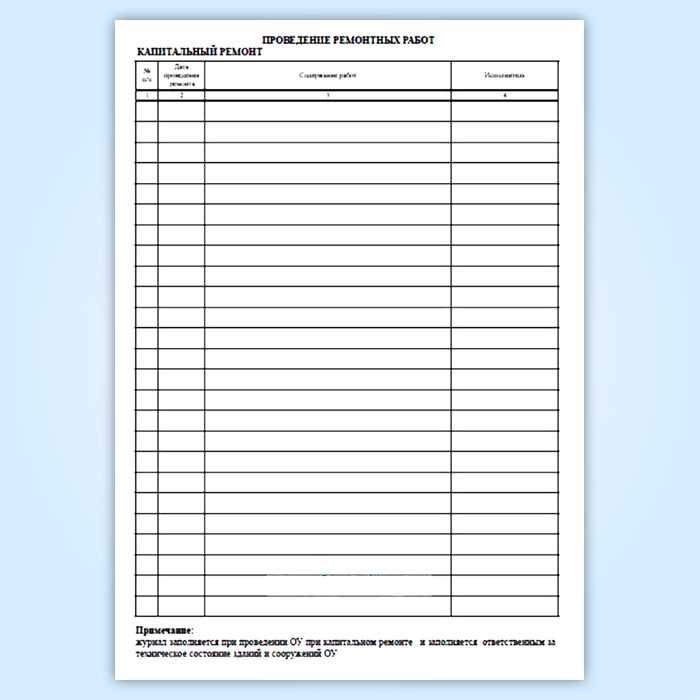 В журнал технической эксплуатации здания (сооружения) ГОУзаносятся данные о результатах наблюдений за зданием или сооружением и их конструктивными элементами, прогибов и других деформаций отдельных конструктивных элементов; основные заключения по результатам периодических осмотров здания и сооружения; основные данные о проведенных ремонтах (сроки, характер, объем); основные данные о проведенных реконструкциях (сроки, характер).