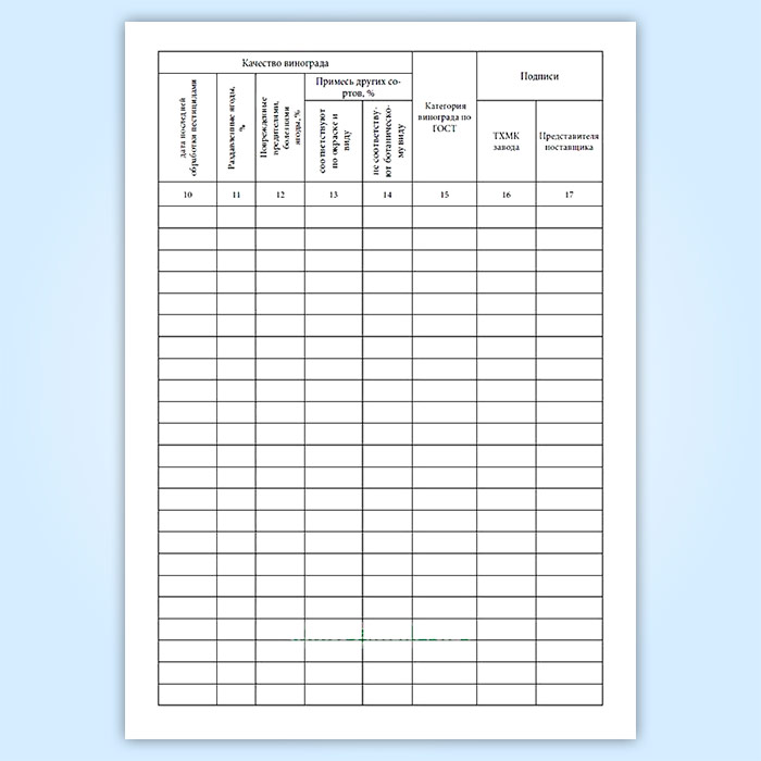 В графах 12-15 указывается содержание в процентах раздавленных и поврежденных вредителями и болезнями ягод, определяемое в соответствии с пунктом 2.4 ГОСТ 24433-80 (отменен, принят ГОСТ 31782-2012 Виноград свежий машинной и ручной уборки для промышленной переработки. Технические условия) и примесь других сортов по пункту 2.3 того же ГОСТа.