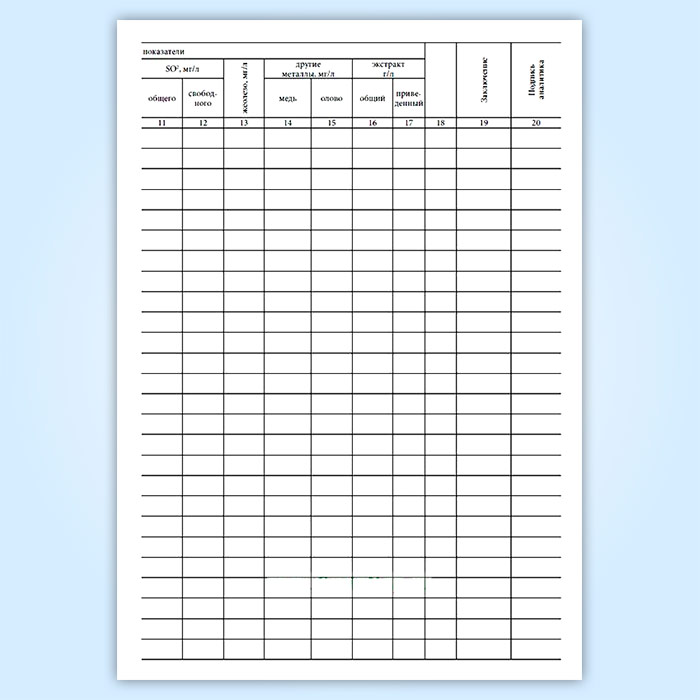 Служит для регистрации всех анализов сусла, вина, виноматериалов, вспомогательных материалов. Рекомендуется вести журнал отдельно для контроля поступающих виноматериалов, для выпуска готовой продукции, для вспомогательных виноматериалов.