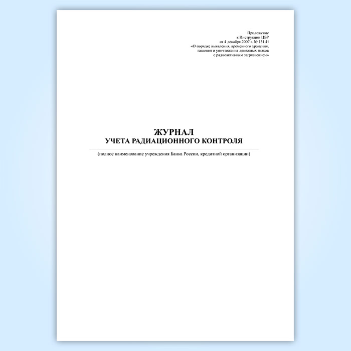 Форма журнала учета радиационного контроля соответствует Приложению 3 к Сведения, отражаемые в журнале учета радиационного контроля Инструкция Банка России от 04.12.2007 N 131-И "О порядке выявления, временного хранения, гашения и уничтожения денежных знаков с радиоактивным загрязнением" (Зарегистрировано в Минюсте РФ 29.12.2007 N 10846)