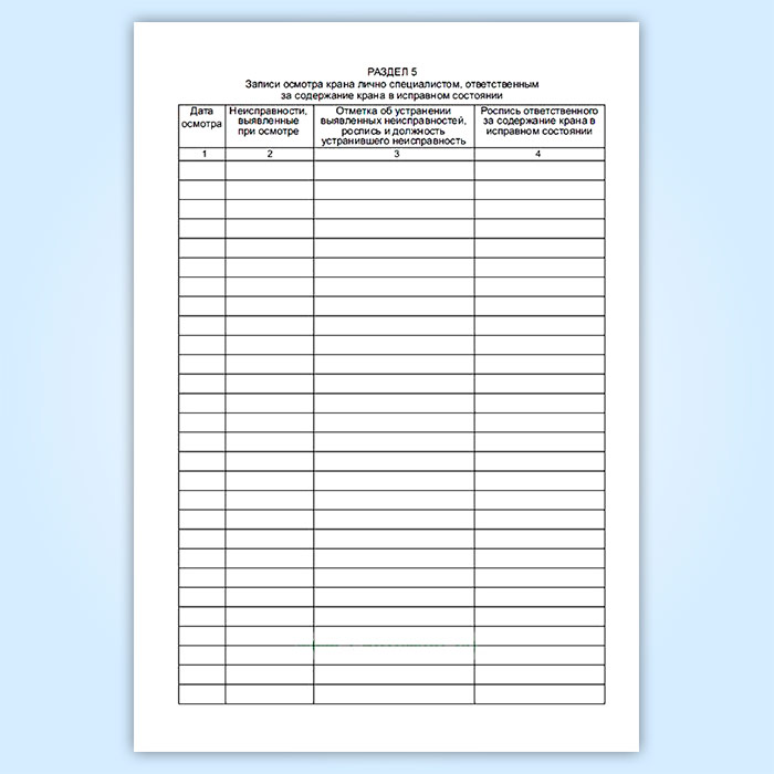 11. Раздел «Замечания о техническом состоянии, ремонтные работы и осмотры крана» заполняется лицами, несущими ответственность за техническое состояние крана и производившими осмотр (групповой механик, начальник эксплуатационного участка, представители управления механизации треста и органов надзора).
