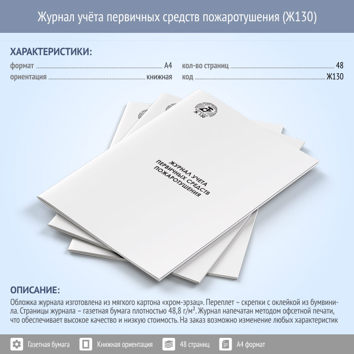 Заказывая Журнал учета первичных средств пожаротушения у нас, Вы можете выбрать любое исполнение обложки и количество страниц в нем. Согласно правилам, страницы журнала прошнуровываются и пронумеровываются. Оставшаяся часть шнура приклеивается к последней странице частью листа бумаги, на котором указывается количество страниц. Все скрепляется печатью организации и подписывается ответственным должностным лицом, ведущим учет журналов