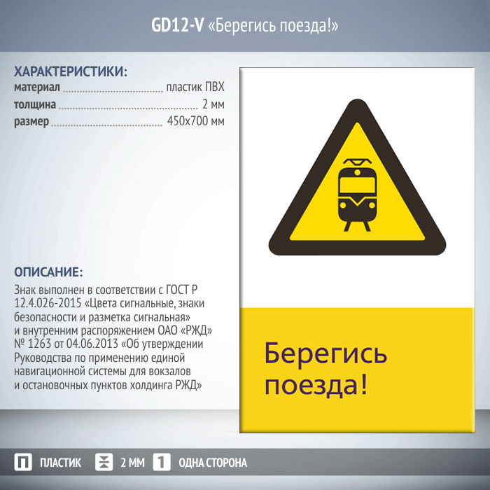 Знак безопасности «Берегись поезда!» выполняется в одностороннем (металл и пластик) и двустороннем (только металл) виде, на ПВХ-пластике, толщиной 2 мм или листе оцинкованного металла, толщиной 0,8 мм. Размеры знаков - 450 мм х 700 мм (вертикальная ориентация) либо 540 мм х 220 мм (горизонтальная ориентация). Знаки изготавливаются в полном соответствии с ГОСТ Р 12.4.026-2015 «Цвета сигнальные, знаки безопасности и разметка сигнальная» и внутренним распоряжением ОАО «РЖД» № 1263 от 04.06.2013 «Об утверждении Руководства по применению единой навигационной системы для вокзалов и остановочных пунктов холдинга РЖД». По желанию заказчика возможно использование светоотражающих материалов. Так же при необходимости производим закругление углов знака