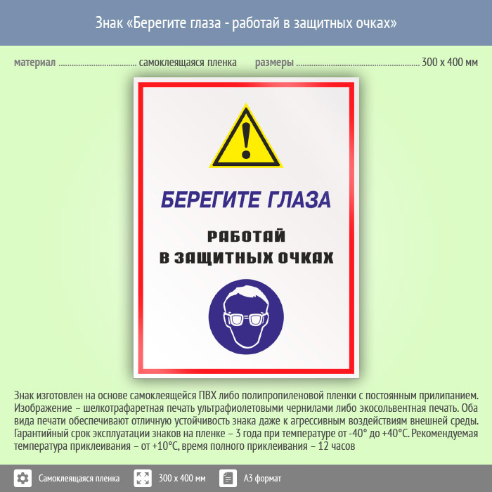 Знак «Берегите глаза – работай в защитных очках» может быть изготовлен любого размера на самоклеящейся пленке, пластике толщиной 0.5, 2 или 4 мм и металле. Также возможно применение фотолюминесцентных и световозвращающих материалов