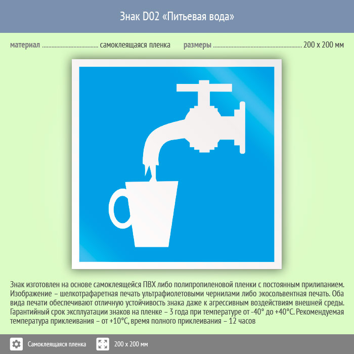 Знак «Питьевая вода» имеет размер 200х200 мм