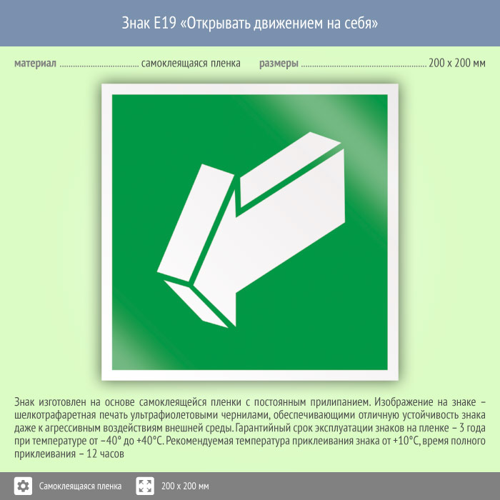 Знак «Открывать движением на себя» может быть изготовлен любого размера на самоклеящейся пленке, пластике толщиной 0.5, 2 или 4 мм и металле. Также возможно применение фотолюминесцентных и световозвращающих материалов