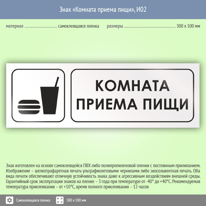 Знак «Комната приема пищи» может быть изготовлен любого размера на самоклеящейся пленке, пластике толщиной 0.5, 2 или 4 мм и металле. Также возможно применение фотолюминесцентных и световозвращающих материалов