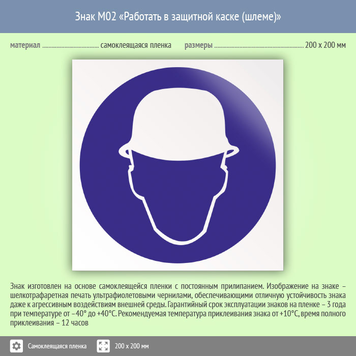 Знак «Работать в защитной каске (шлеме)» имеет размер 200х200 мм