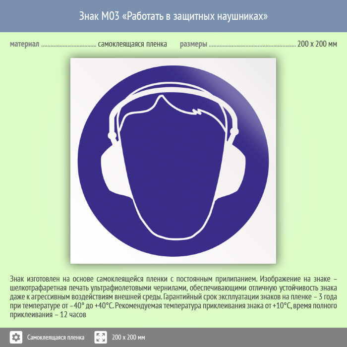 Знак «Работать в защитных наушниках» имеет размер 200х200 мм