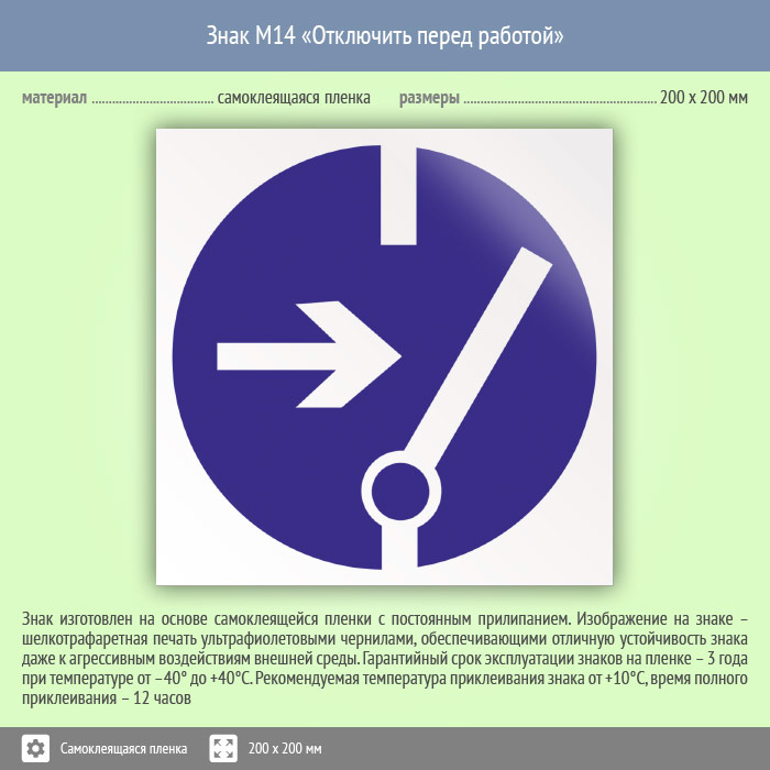 Знак «Отключить перед работой» имеет размер 200х200 мм