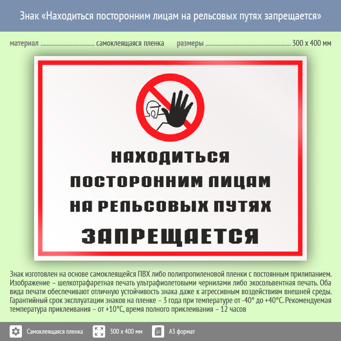 Знак «Находиться посторонним лицам на рельсовых путях запрещается» может быть изготовлен любого размера на самоклеящейся пленке, пластике толщиной 0.5, 2 или 4 мм и металле. Также возможно применение фотолюминесцентных и световозвращающих материалов