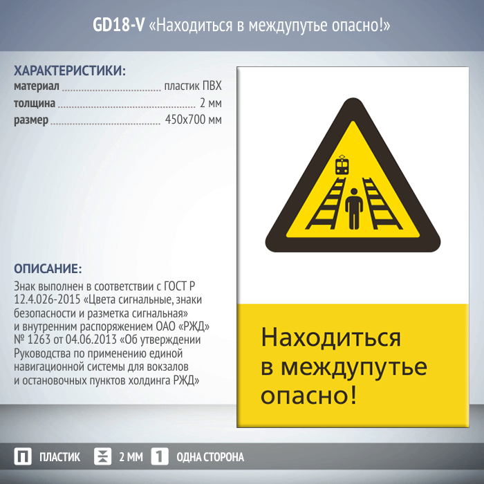 Знак безопасности «Находиться в междупутье опасно!» выполняется в одностороннем (металл и пластик) и двустороннем (только металл) виде, на ПВХ-пластике, толщиной 2 мм или листе оцинкованного металла, толщиной 0,8 мм. Размеры знаков - 450 мм х 700 мм (вертикальная ориентация) либо 540 мм х 220 мм (горизонтальная ориентация). Знаки изготавливаются в полном соответствии с ГОСТ Р 12.4.026-2015 «Цвета сигнальные, знаки безопасности и разметка сигнальная» и внутренним распоряжением ОАО «РЖД» № 1263 от 04.06.2013 «Об утверждении Руководства по применению единой навигационной системы для вокзалов и остановочных пунктов холдинга РЖД». По желанию заказчика возможно использование светоотражающих материалов. Так же при необходимости производим закругление углов знака