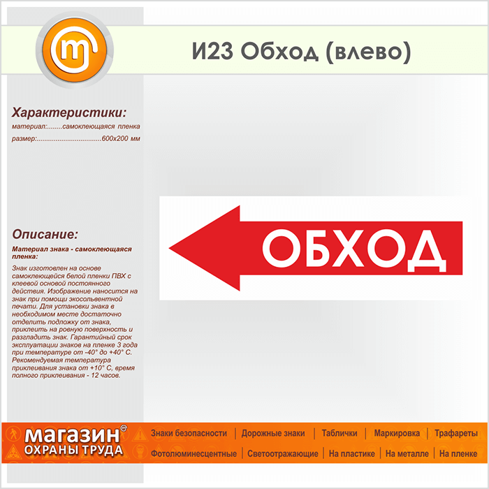 Знак «Обход (влево)» может быть изготовлен любого размера на самоклеящейся пленке, пластике толщиной 0.5, 2 или 4 мм и металле. Также возможно применение фотолюминесцентных и световозвращающих материалов