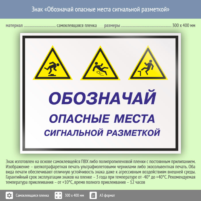 Знак «Обозначай опасные места сигнальной разметкой» может быть изготовлен любого размера на самоклеящейся пленке, пластике толщиной 0.5, 2 или 4 мм и металле. Также возможно применение фотолюминесцентных и световозвращающих материалов