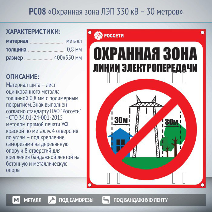Знак «Охранная зона ЛЭП 330 кВ – 30 метров», РС08 (металл, 400х550 мм, отверстия под бандажную ленту)