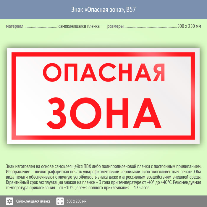 Табличка «Опасная зона» предупреждает о близости расположения опасного места. Код знака: B57