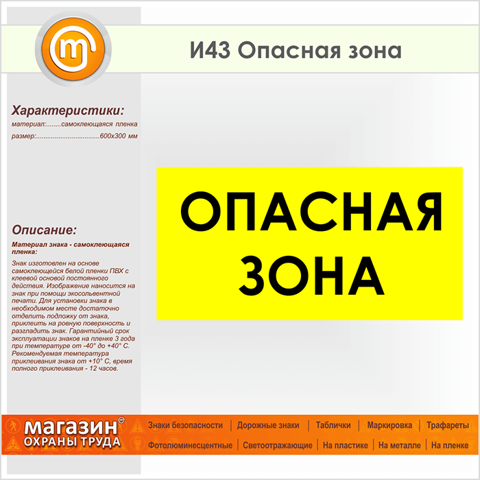 Знак «Опасная зона» может быть изготовлен любого размера на самоклеящейся пленке, пластике толщиной 0.5, 2 или 4 мм и металле. Также возможно применение фотолюминесцентных и световозвращающих материалов