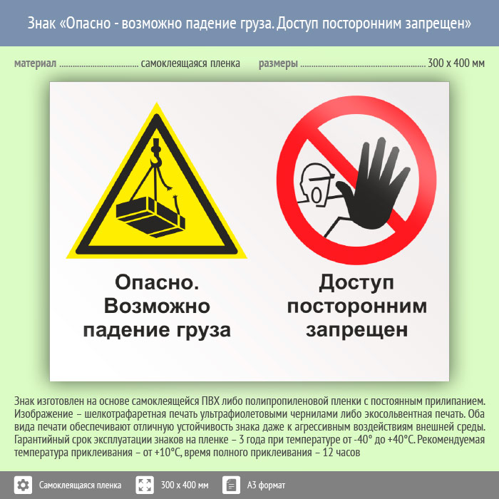 Знак «Опасно – возможно падение груза. Доступ посторонним запрещен» может быть изготовлен любого размера на самоклеящейся пленке, пластике толщиной 0.5, 2 или 4 мм и металле. Также возможно применение фотолюминесцентных и световозвращающих материалов