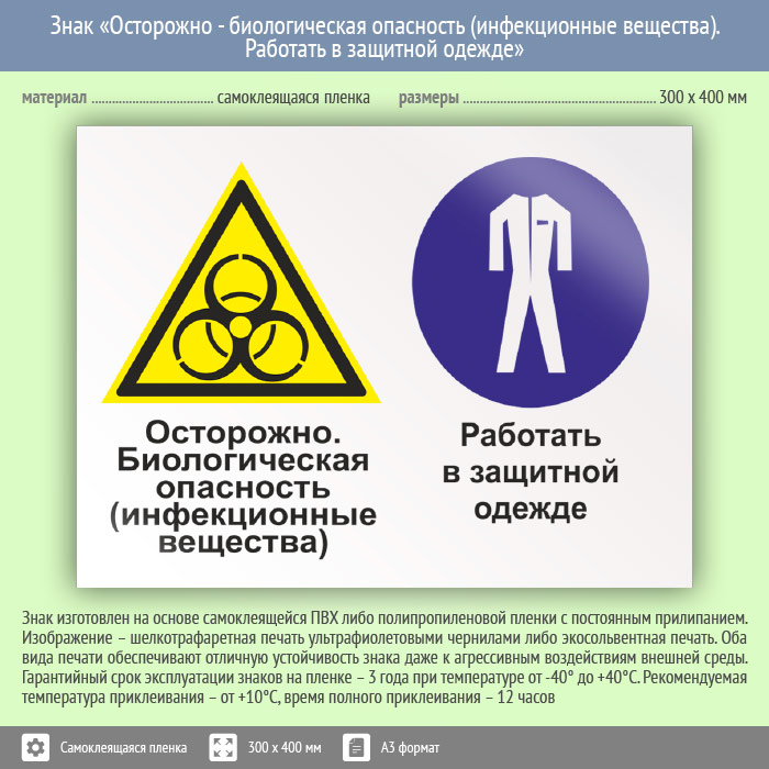 Знак «Осторожно – биологическая опасность (инфекционные вещества). Работать в защитной одежде» может быть изготовлен любого размера на самоклеящейся пленке, пластике толщиной 0.5, 2 или 4 мм и металле. Также возможно применение фотолюминесцентных и световозвращающих материалов
