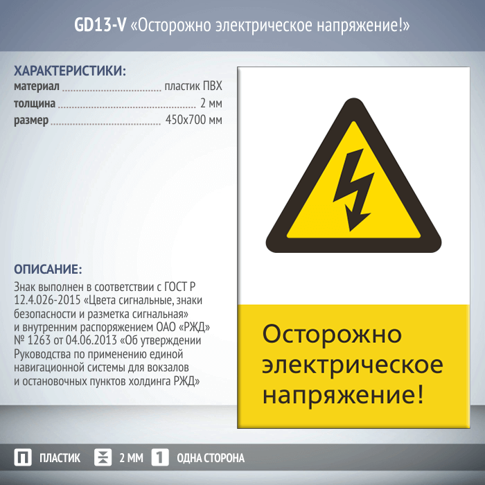 Знак безопасности «Осторожно электрическое напряжение!» выполняется в одностороннем (металл и пластик) и двустороннем (только металл) виде, на ПВХ-пластике, толщиной 2 мм или листе оцинкованного металла, толщиной 0,8 мм. Размеры знаков - 450 мм х 700 мм (вертикальная ориентация) либо 540 мм х 220 мм (горизонтальная ориентация). Знаки изготавливаются в полном соответствии с ГОСТ Р 12.4.026-2015 «Цвета сигнальные, знаки безопасности и разметка сигнальная» и внутренним распоряжением ОАО «РЖД» № 1263 от 04.06.2013 «Об утверждении Руководства по применению единой навигационной системы для вокзалов и остановочных пунктов холдинга РЖД». По желанию заказчика возможно использование светоотражающих материалов. Так же при необходимости производим закругление углов знака