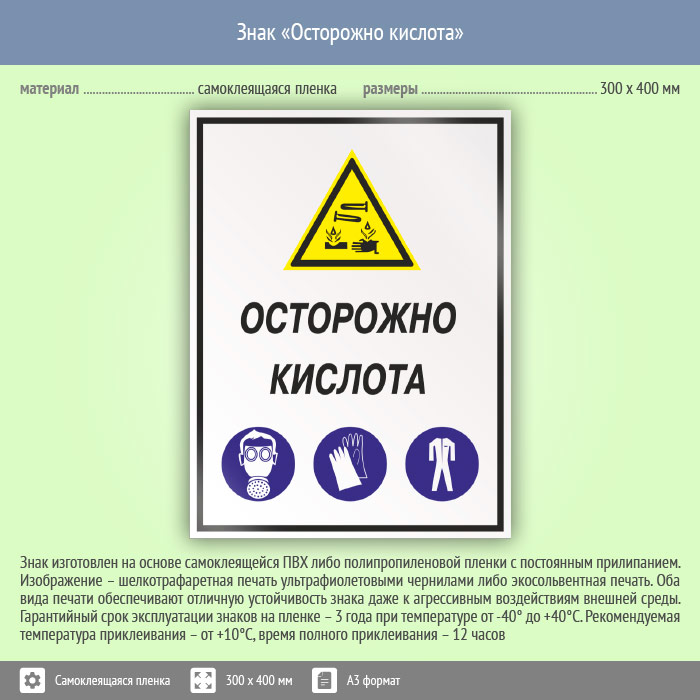 Знак «Осторожно кислота» может быть изготовлен любого размера на самоклеящейся пленке, пластике толщиной 0.5, 2 или 4 мм и металле. Также возможно применение фотолюминесцентных и световозвращающих материалов