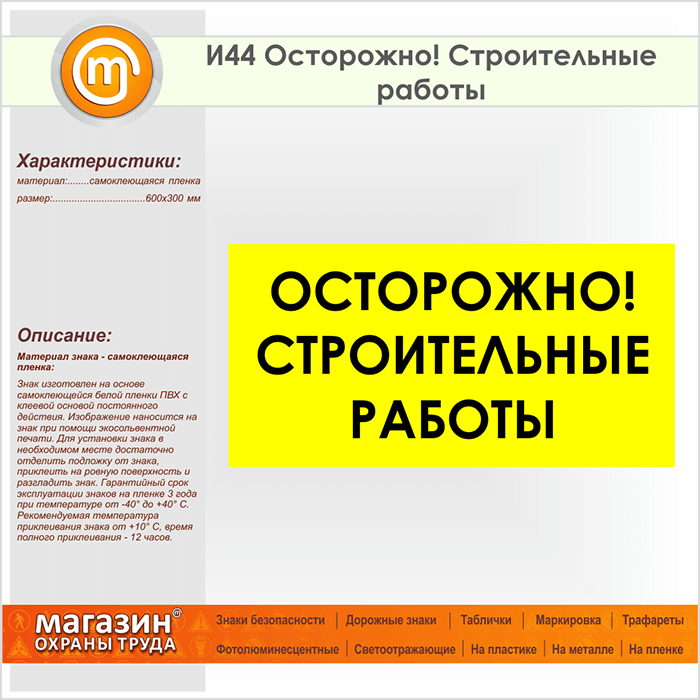 Знак «Осторожно! Строительные работы» может быть изготовлен любого размера на самоклеящейся пленке, пластике толщиной 0.5, 2 или 4 мм и металле. Также возможно применение фотолюминесцентных и световозвращающих материалов