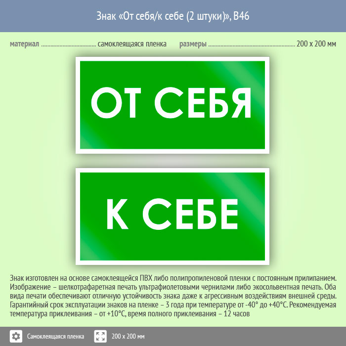 Знак «От себя/к себе (2 штуки)» может быть изготовлен любого размера на самоклеящейся пленке, пластике толщиной 0.5, 2 или 4 мм и металле. Также возможно применение фотолюминесцентных и световозвращающих материалов