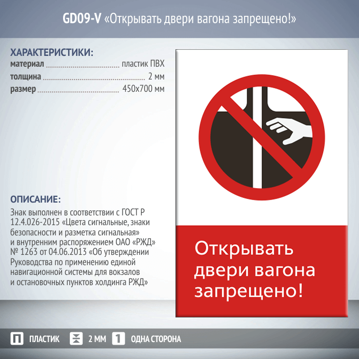 Знак безопасности «Открывать двери вагона запрещено!» выполняется в одностороннем (металл и пластик) и двустороннем (только металл) виде, на ПВХ-пластике, толщиной 2 мм или листе оцинкованного металла, толщиной 0,8 мм. Размеры знаков - 450 мм х 700 мм (вертикальная ориентация) либо 540 мм х 220 мм (горизонтальная ориентация). Знаки изготавливаются в полном соответствии с ГОСТ Р 12.4.026-2015 «Цвета сигнальные, знаки безопасности и разметка сигнальная» и внутренним распоряжением ОАО «РЖД» № 1263 от 04.06.2013 «Об утверждении Руководства по применению единой навигационной системы для вокзалов и остановочных пунктов холдинга РЖД». По желанию заказчика возможно использование светоотражающих материалов. Так же при необходимости производим закругление углов знака