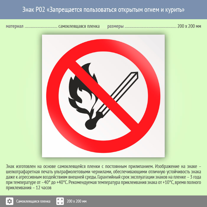 Знак «Запрещается пользоваться открытым огнем и курить» может быть изготовлен любого размера на самоклеящейся пленке, пластике толщиной 0.5, 2 или 4 мм и металле. Также возможно применение фотолюминесцентных и световозвращающих материалов