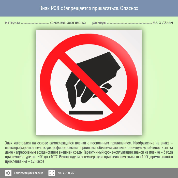 Знак «Запрещается прикасаться.Опасно» может быть изготовлен любого размера на самоклеящейся пленке, пластике толщиной 0.5, 2 или 4 мм и металле. Также возможно применение фотолюминесцентных и световозвращающих материалов