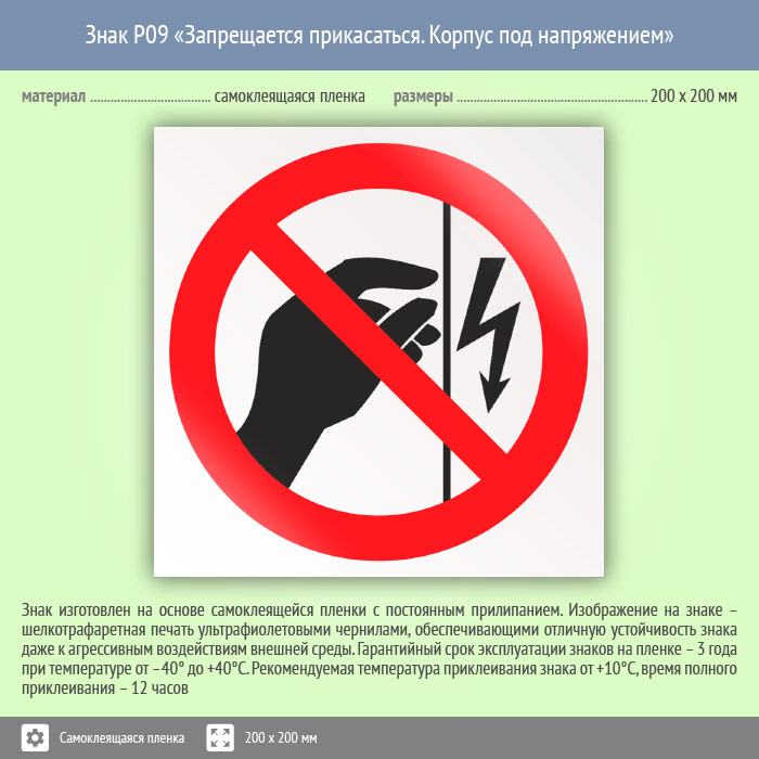 Знак «Запрещается прикасаться. Корпус под напряжением» может быть изготовлен любого размера на самоклеящейся пленке, пластике толщиной 0.5, 2 или 4 мм и металле. Также возможно применение фотолюминесцентных и световозвращающих материалов