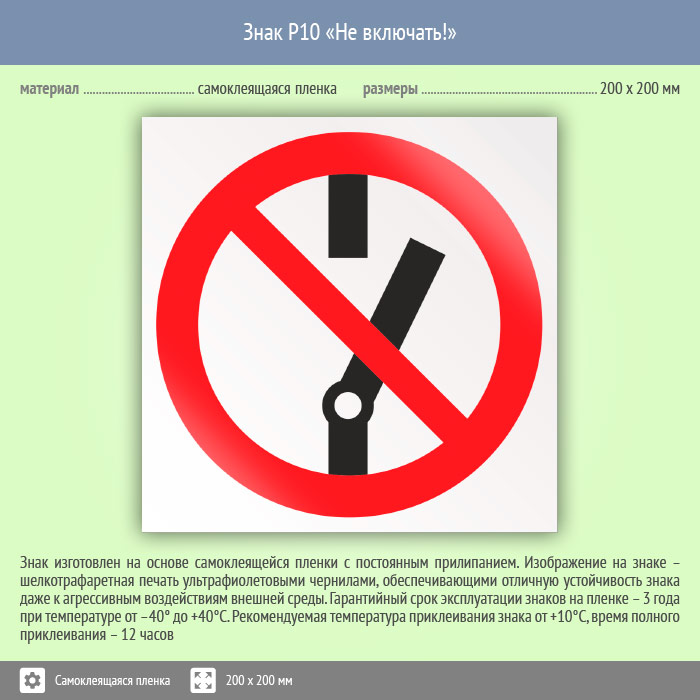 Знак «Не включать!» может быть изготовлен любого размера на самоклеящейся пленке, пластике толщиной 0.5, 2 или 4 мм и металле. Также возможно применение фотолюминесцентных и световозвращающих материалов