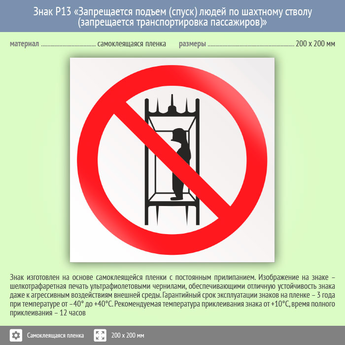 Знак «Запрещается подъем (спуск) людей по шахтному стволу (запрещается транспортировка пассажиров)» может быть изготовлен любого размера на самоклеящейся пленке, пластике толщиной 0.5, 2 или 4 мм и металле. Также возможно применение фотолюминесцентных и световозвращающих материалов