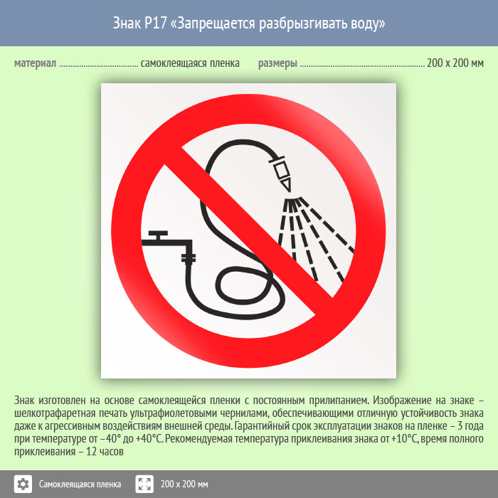Знак «Запрещается разбрызгивать воду» может быть изготовлен любого размера на самоклеящейся пленке, пластике толщиной 0.5, 2 или 4 мм и металле. Также возможно применение фотолюминесцентных и световозвращающих материалов