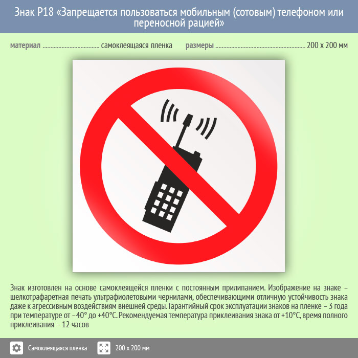 Знак «Запрещается пользоваться мобильным (сотовым) телефоном или переносной рацией» может быть изготовлен любого размера на самоклеящейся пленке, пластике толщиной 0.5, 2 или 4 мм и металле. Также возможно применение фотолюминесцентных и световозвращающих материалов