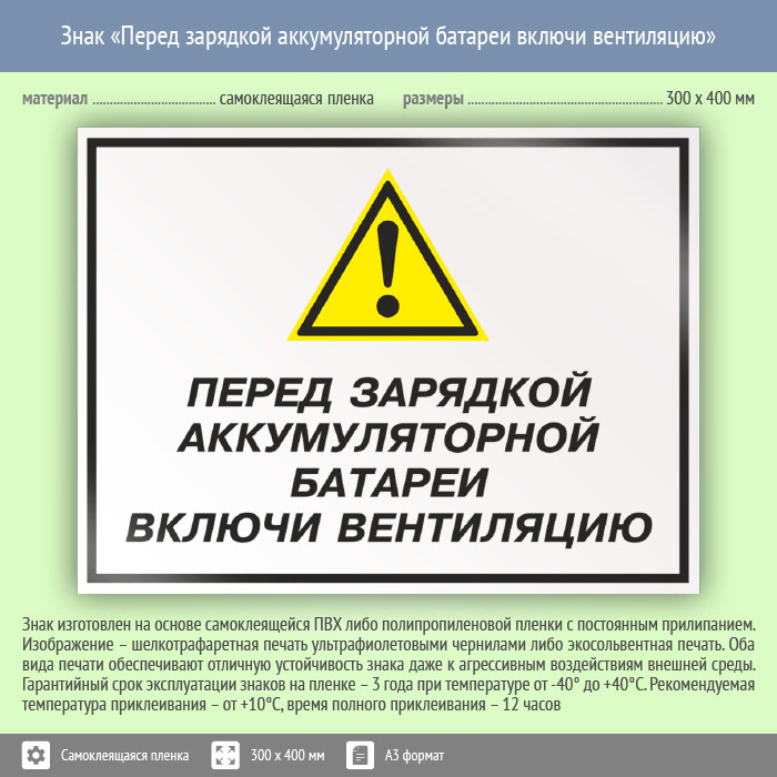 Знак «Перед зарядкой аккумуляторной батареи включи вентиляцию» может быть изготовлен любого размера на самоклеящейся пленке, пластике толщиной 0.5, 2 или 4 мм и металле. Также возможно применение фотолюминесцентных и световозвращающих материалов