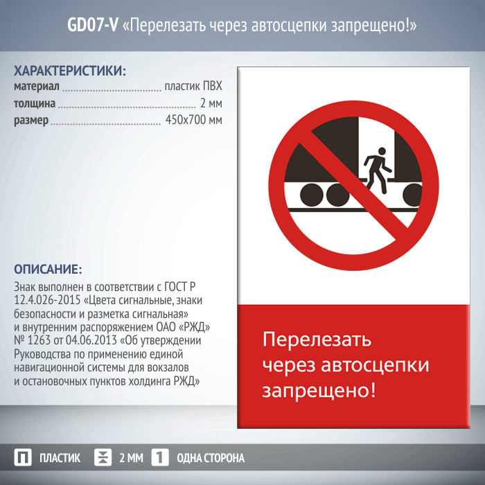 Знак безопасности «Перелезать через автосцепки запрещено!» выполняется в одностороннем (металл и пластик) и двустороннем (только металл) виде, на ПВХ-пластике, толщиной 2 мм или листе оцинкованного металла, толщиной 0,8 мм. Размеры знаков - 450 мм х 700 мм (вертикальная ориентация) либо 540 мм х 220 мм (горизонтальная ориентация). Знаки изготавливаются в полном соответствии с ГОСТ Р 12.4.026-2015 «Цвета сигнальные, знаки безопасности и разметка сигнальная» и внутренним распоряжением ОАО «РЖД» № 1263 от 04.06.2013 «Об утверждении Руководства по применению единой навигационной системы для вокзалов и остановочных пунктов холдинга РЖД». По желанию заказчика возможно использование светоотражающих материалов. Так же при необходимости производим закругление углов знака